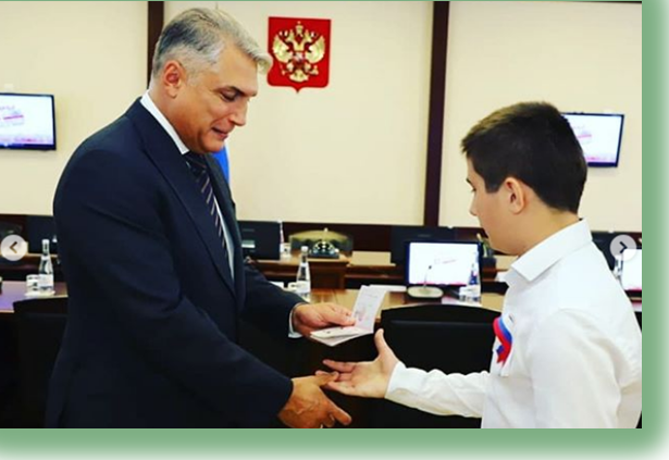 Ученик 8 "Б" класса Исламгириев Т., на торжественном вручении паспорта полномочным представителем президента РФ в Северо-Кавказском федеральном округе (СКФО)Александром Матовниковым.