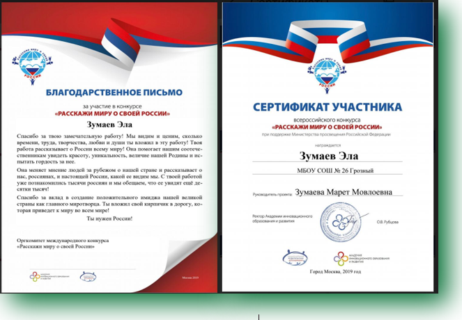 Сегодня 23.11.2019 наш ученик Зумаев Э. получил сертификат всероссийского конкурс "Расскажи миру о своей России"
