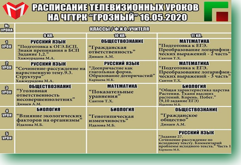 16.05.2020Уважаемые родители!Министерство образования и науки ЧР совместно с ЧГТРК «Грозный» продолжает реализацию проекта «Телешкола» Представляем Вашему вниманию расписание занятий на 16.05.2020. Расписание также опубликовано На сайте Министерства образования и науки ЧРУроки проходят с 9:00 в эфире ЧГТРК «Грозный».