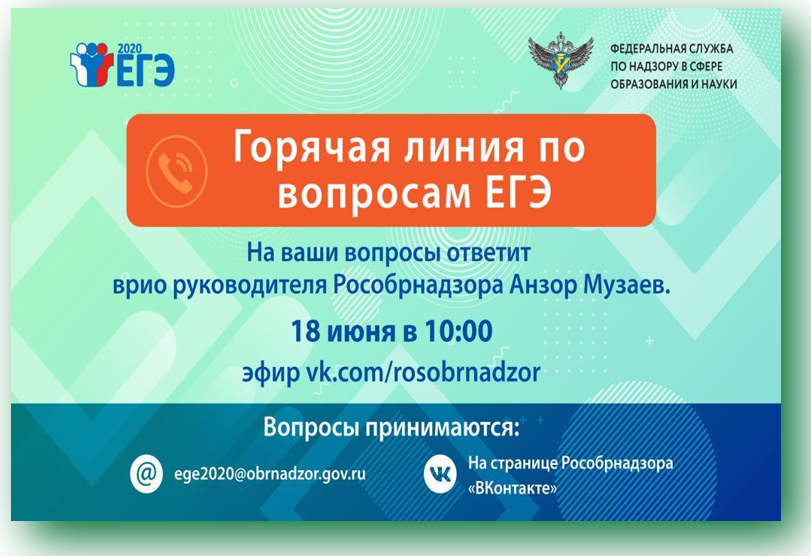 18.06.2020Горячая линия, посвященная проведению государственной итоговой аттестации в 2020 году, пройдет в Ситуационно-информационном центре Федеральной службы по надзору в сфере образования и науки 18 июня в 10:00. Ее трансляция будет вестись в прямом эфире в сообществе Рособрнадзора в социальной сети «ВКонтакте».