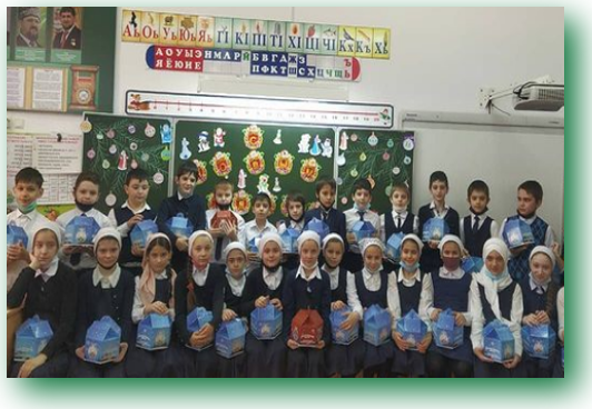 28.12.2020В нашей школе прошли новогодние мероприятия для учащихся 1-4 классов в соответствии с требованиями Роспотребнадзора. Несмотря на то, что массовые мероприятия были заменены на новогодние утренники в классах, дети не остались без внимания и подарков от Регионального общественного фонда имени Героя России Ахмат- Хаджи Кадырова. Дала саг1а дойла совг1аташ!