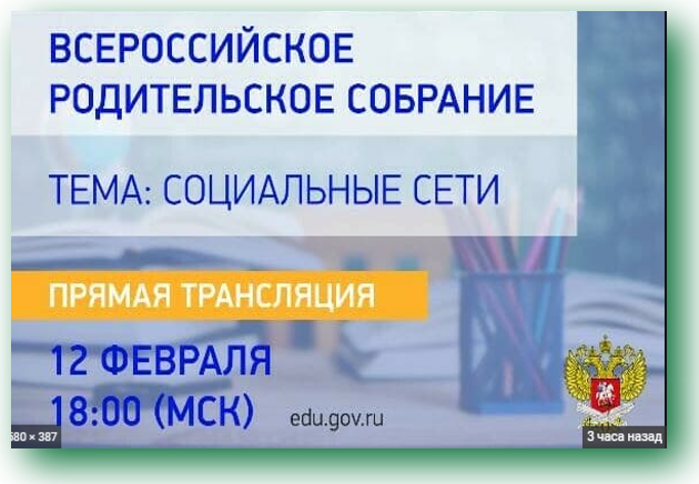 12.02.2021Министерство просвещения России информирует о проведении Всероссийского родительского собрания 12 февраля 2021 года 18.00 по московскому времени на тему «Социальные сети».Приглашаем родителей присоединиться к трансляции Всероссийского родительского собрания на тему «Социальные сети», в рамках которого родителей ознакомят с популярными среди детей социальными сетями, особенностями их интереса к ним.Трансляция собрания будет проводиться на официальной странице Минпросвещения России в социальной сети «ВКонтакте», а так же на сайте открытыеуроки.рф https://vk.com/minprosvet
