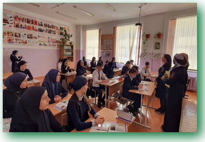 Так-же инспектора ПДН настоятельно рекомендовали соблюдать правила дорожного движения, правила поведения в общественных местах, местах массового отдыха в зимний периуд. Старший Инспектор ОПДН капитан полиции Гадаева Э.Х., разъяснила учащимся об ответственности за причинение телесных повреждений, нарушений правил ДД, ответственность за самовольные уходы с занятий. Ребята с большим вниманием слушали инспекторов полиции и получили ответы на все интересующие их вопросы. Хочется надеяться, что данное мероприятие не прошло даром, и ребята запомнили, что их жизнь и здоровье зависит только от них самих.