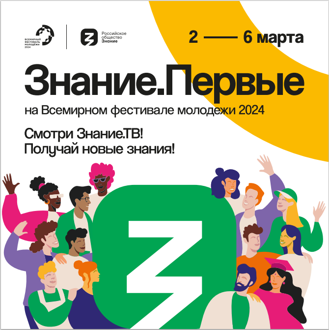 С 2 по 6 марта 2024 года состоится Федеральный просветительский марафон Российского общества «Знание» — Знание.Первые. Марафон пройдет в рамках Всемирного фестиваля молодежи 2024 в Сочи.