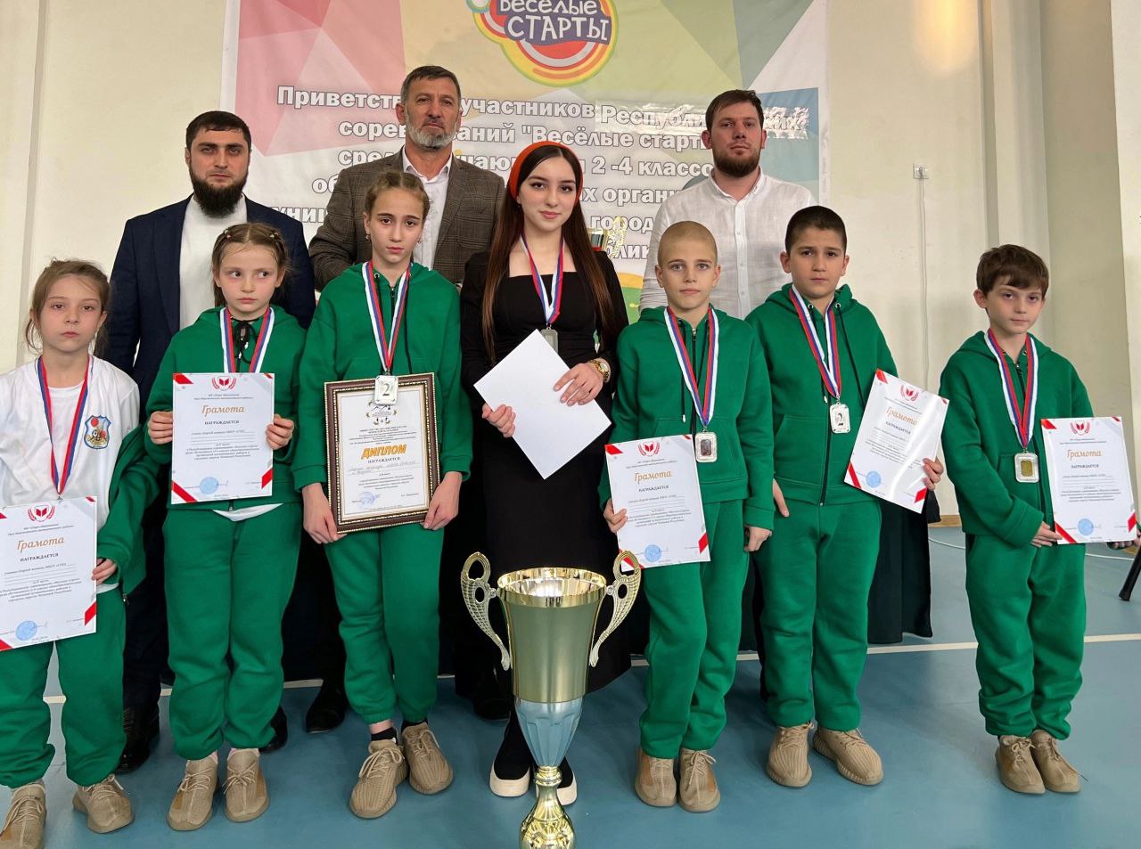КОМАНДА ШКОЛЫ № 26 ГОРОДА ГРОЗНОГО СТАЛА ПРИЗЕРОМ РЕГИОНАЛЬНОГО ЭТАПА ВСЕРОССИЙСКОГО СПОРТИВНОГО ФЕСТИВАЛЯ РОССИЙСКОГО ДВИЖЕНИЯ ШКОЛЬНИКОВ «ВЕСЕЛЫЕ СТАРТЫ». ДАЛА Т1АЬХЬЕ БЕРКАТЕ ЙОЙЛА! МЫ ВАМИ ГОРДИМСЯ
