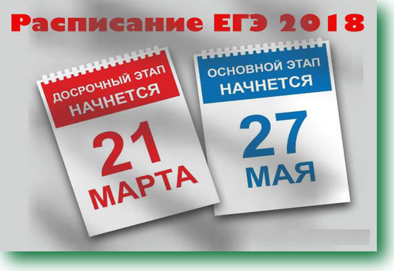 14.12.2017Итоговые экзамены в 2018 году традиционно пройдут в три этапа: досрочный, основной и дополнительный (сентябрьский). Досрочный этап ЕГЭ в 2018 году состоится с 21 марта по 11 апреля, основной – с 28 мая по 2 июля и дополнительный (сентябрьский) – с 4 по 15 сентября.