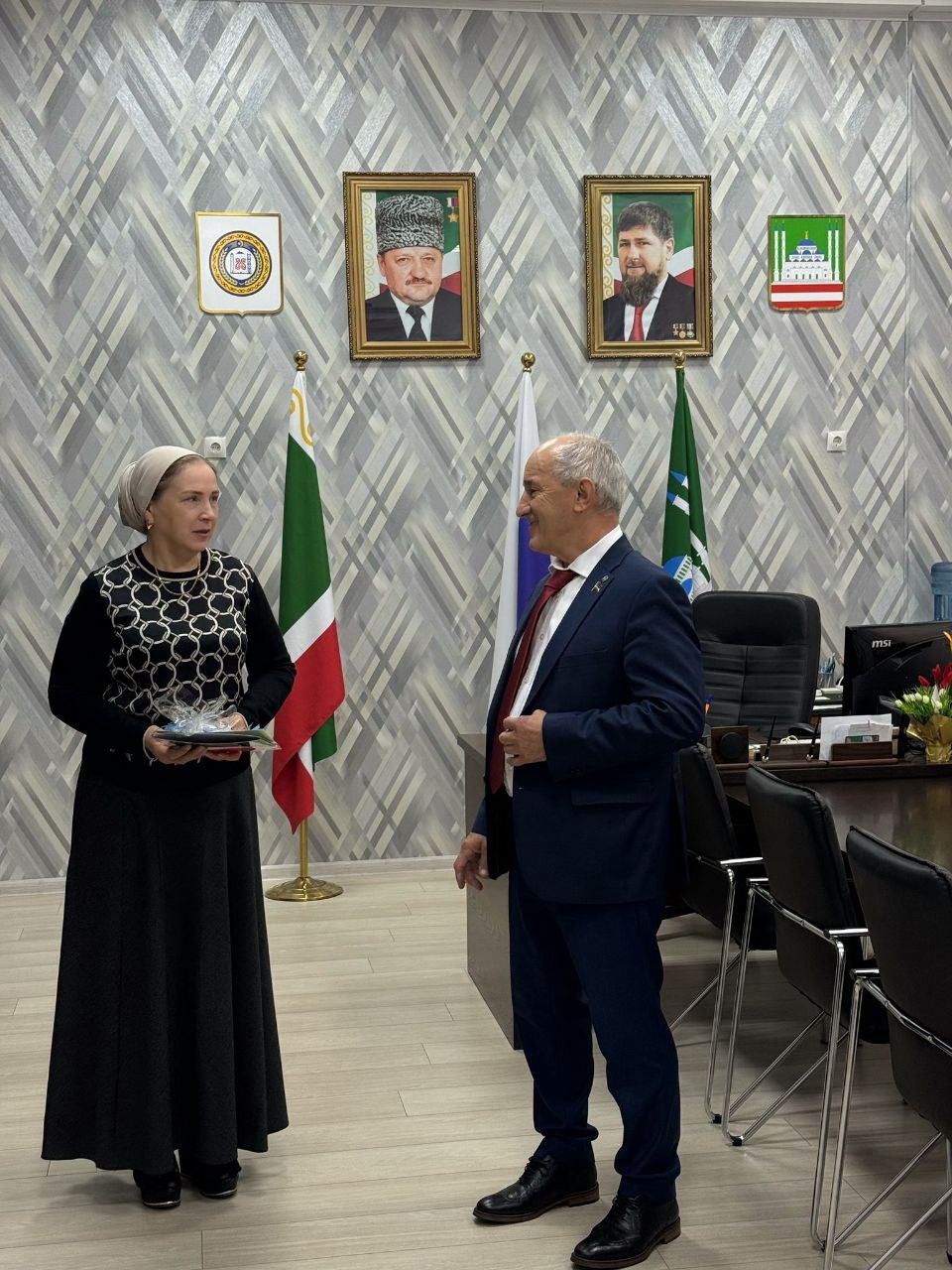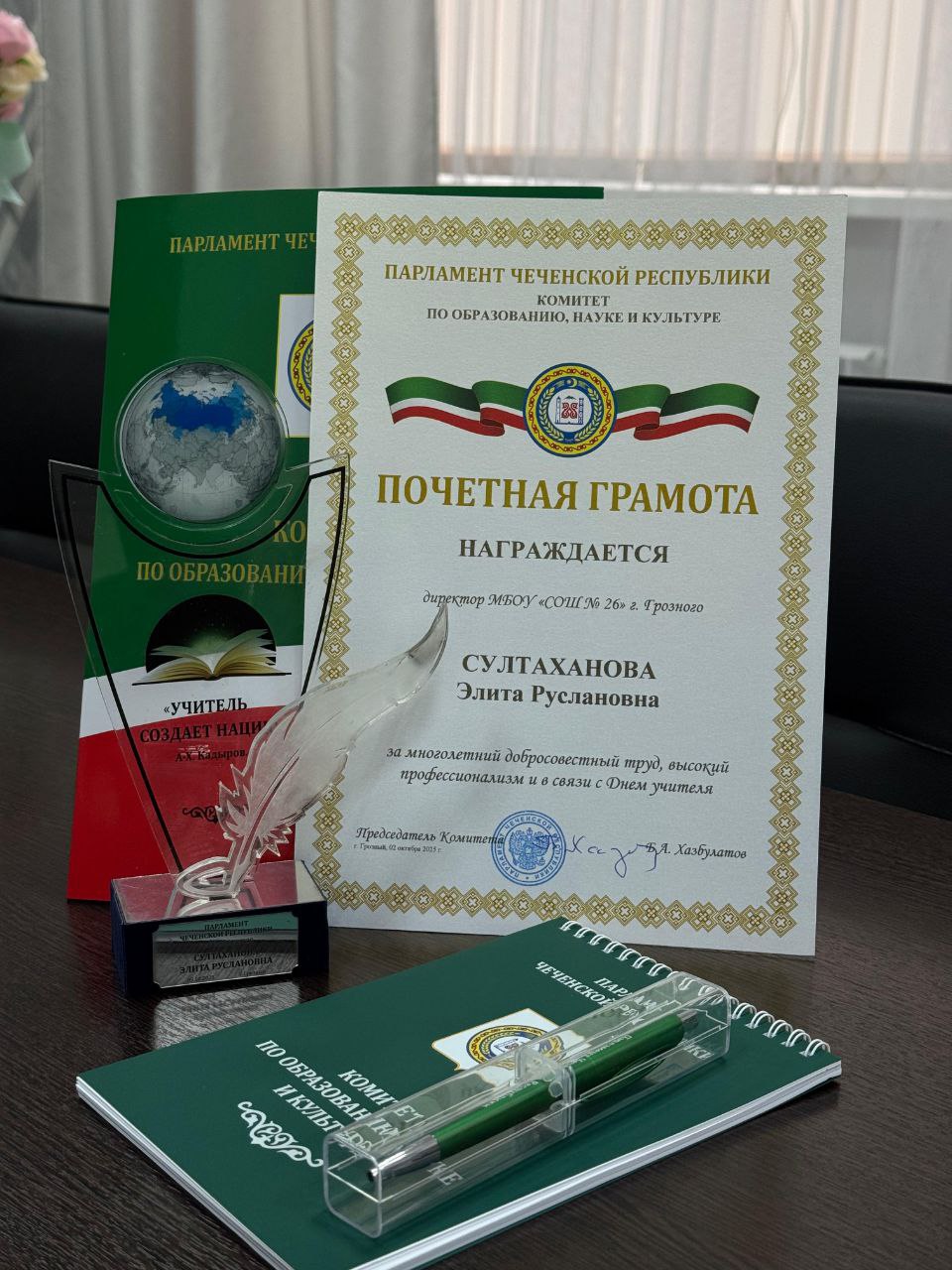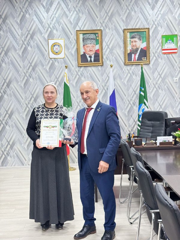 13.10.2025Представители Парламента Чеченской Республики поощрили директора Султаханову Элиту Руслановну Почётной грамотой и подарками за добросовестный многолетний труд в деле воспитания и обучения подрастающего поколения.