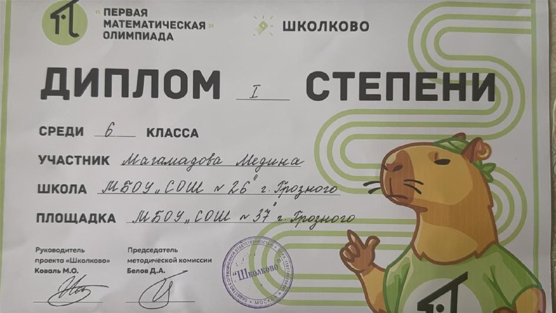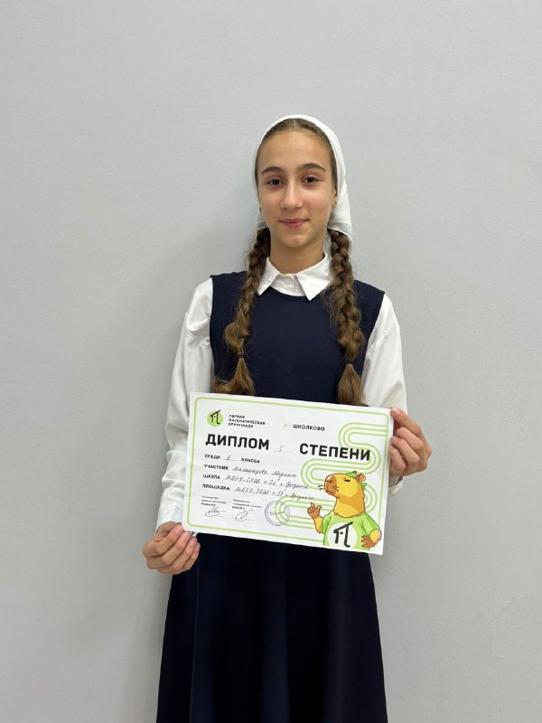 21.10.2025Поздравляем ученицу 6-го класса Магамадову Медину, занявшую первое место на первой математической олимпиаде школьников образовательной платформы «Школково» в Чеченской Республике! Эта олимпиада прошла в рамках реализации федерального национального проекта «Молодёжь и дети», целью которого является стимулирование интереса учащихся к математике путем решения интересных и сложных задач, а также выявление одарённых учеников.Магамадова Медина рассказала: «Математика всегда привлекала меня своей красотой и точностью. Участие в олимпиаде дало мне уникальный шанс почувствовать себя частью команды единомышленников, увлеченных изучением математики».Кроме того, организаторы подчеркнули важность поддержки национальных проектов, способствующих развитию талантов среди молодых россиян, повышению качества математического образования и формированию необходимых навыков, востребованных в современном мире.