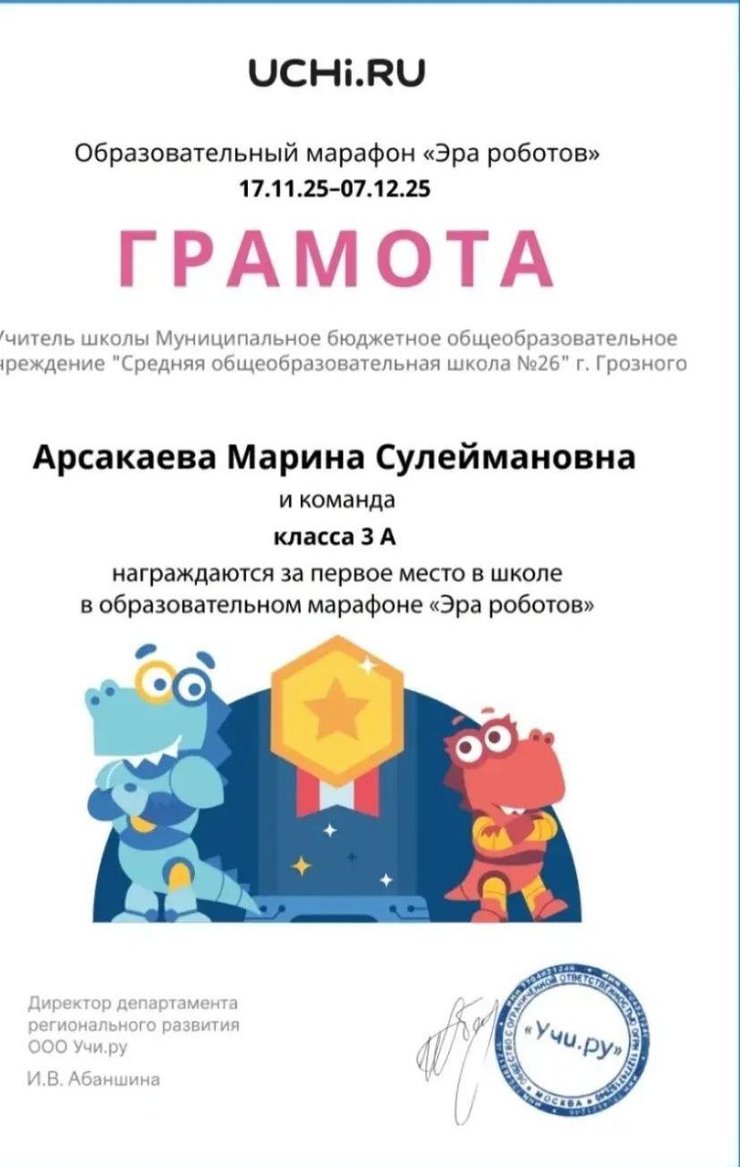 22.01.2026В нашей школе зафиксировано очередное значимое достижение в сфере образовательных инициатив и цифрового обучения. Учитель начальных классов Арсакаева Марина Сулеймановна вместе с командой учащихся 3 «А» класса заняли I место в школе в образовательном марафоне Uchi.ru «Эра роботов», проходившем с 17 ноября по 7 декабря 2025 года.
