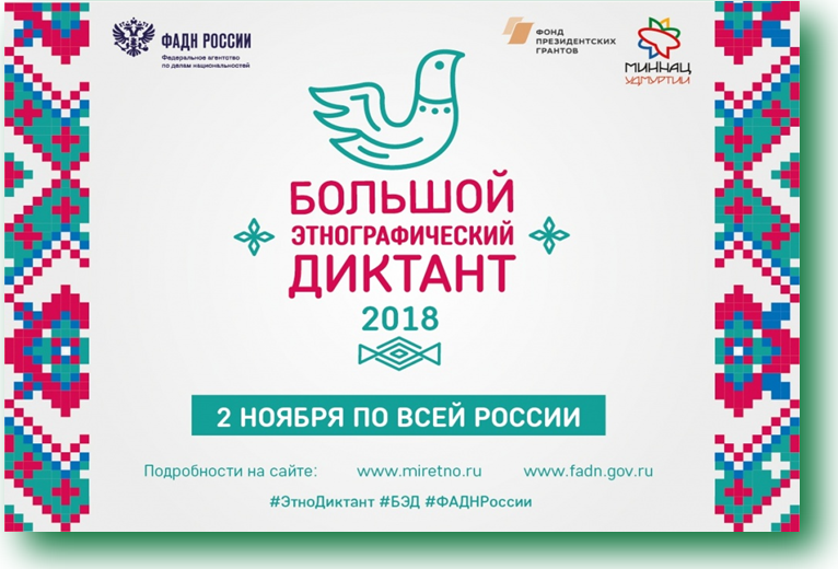 27.10.20182 ноября 2018 года на площадке МБОУ "СОШ№26" г.Грозного пройдет Всероссийская просветительская акция "Большой этнографический диктант". Текст диктанта включает в себя 30 вопросов: 20 федеральных и 10 региональных. Время выполнения 30 минут. Регистрация участников 9.00-9.40. Участие в диктанте 10.00-10.45. Приглашаются родителя, учителя и гимназисты с 14 лет. Примем участие в акции вместе со всей страной!